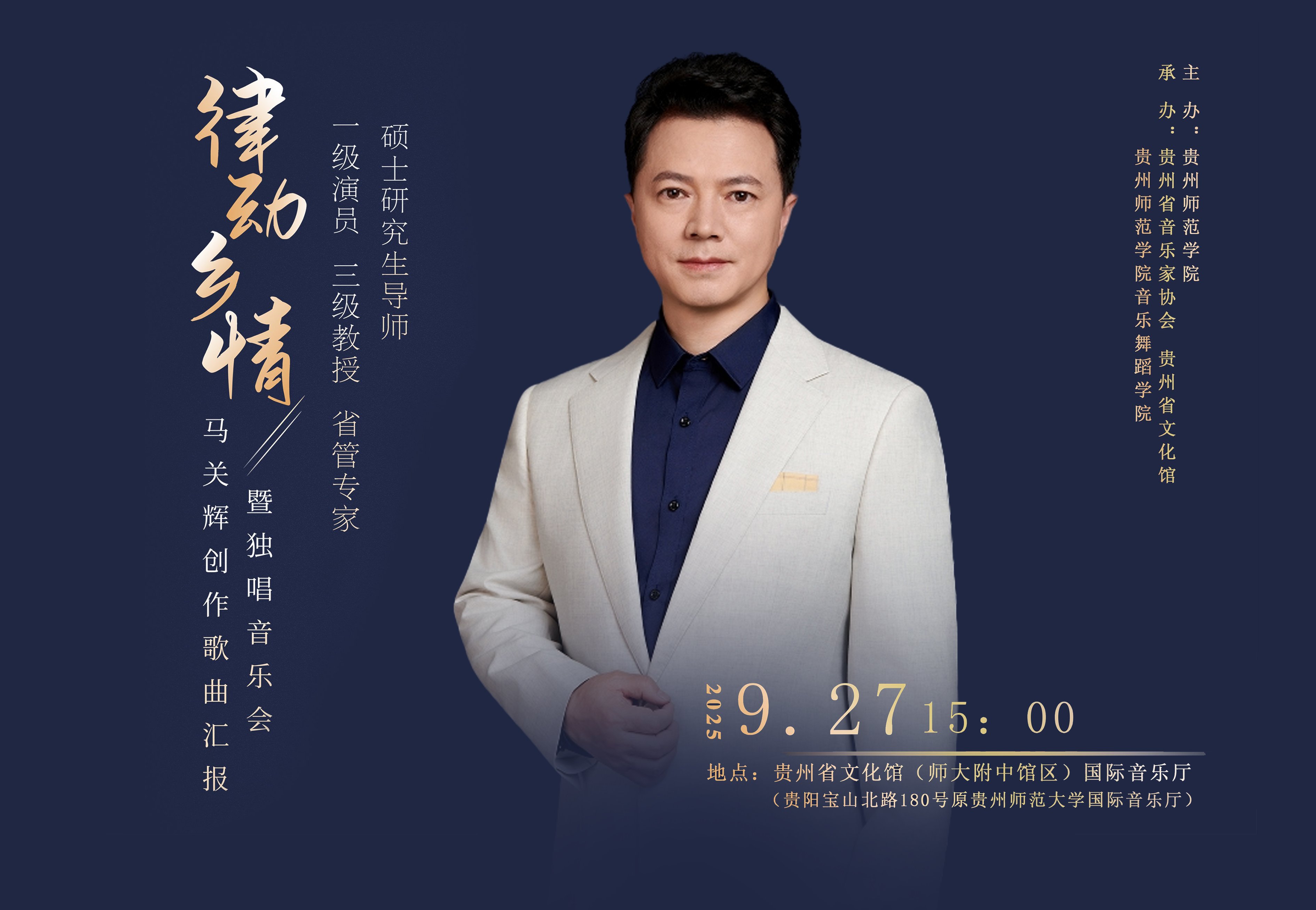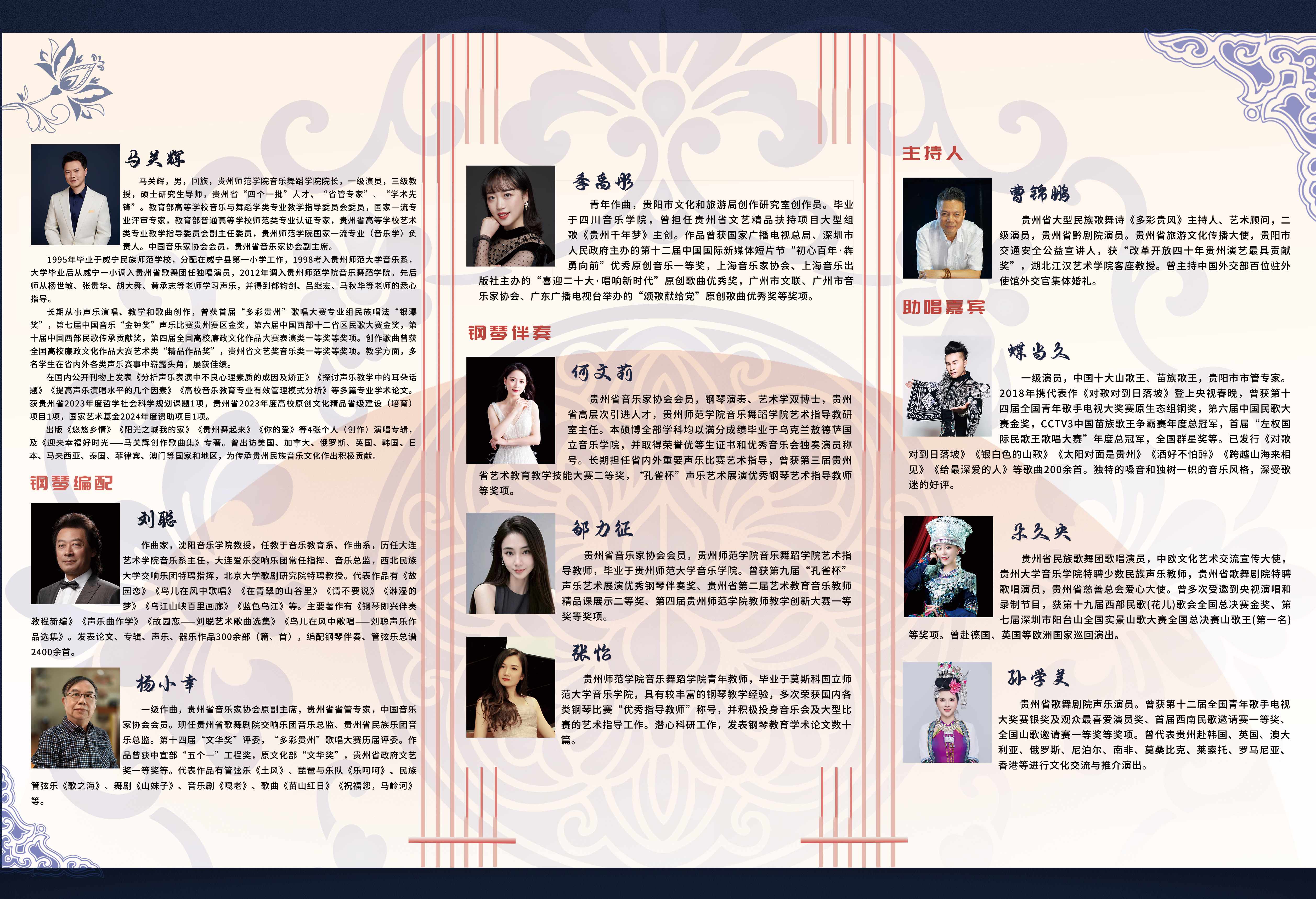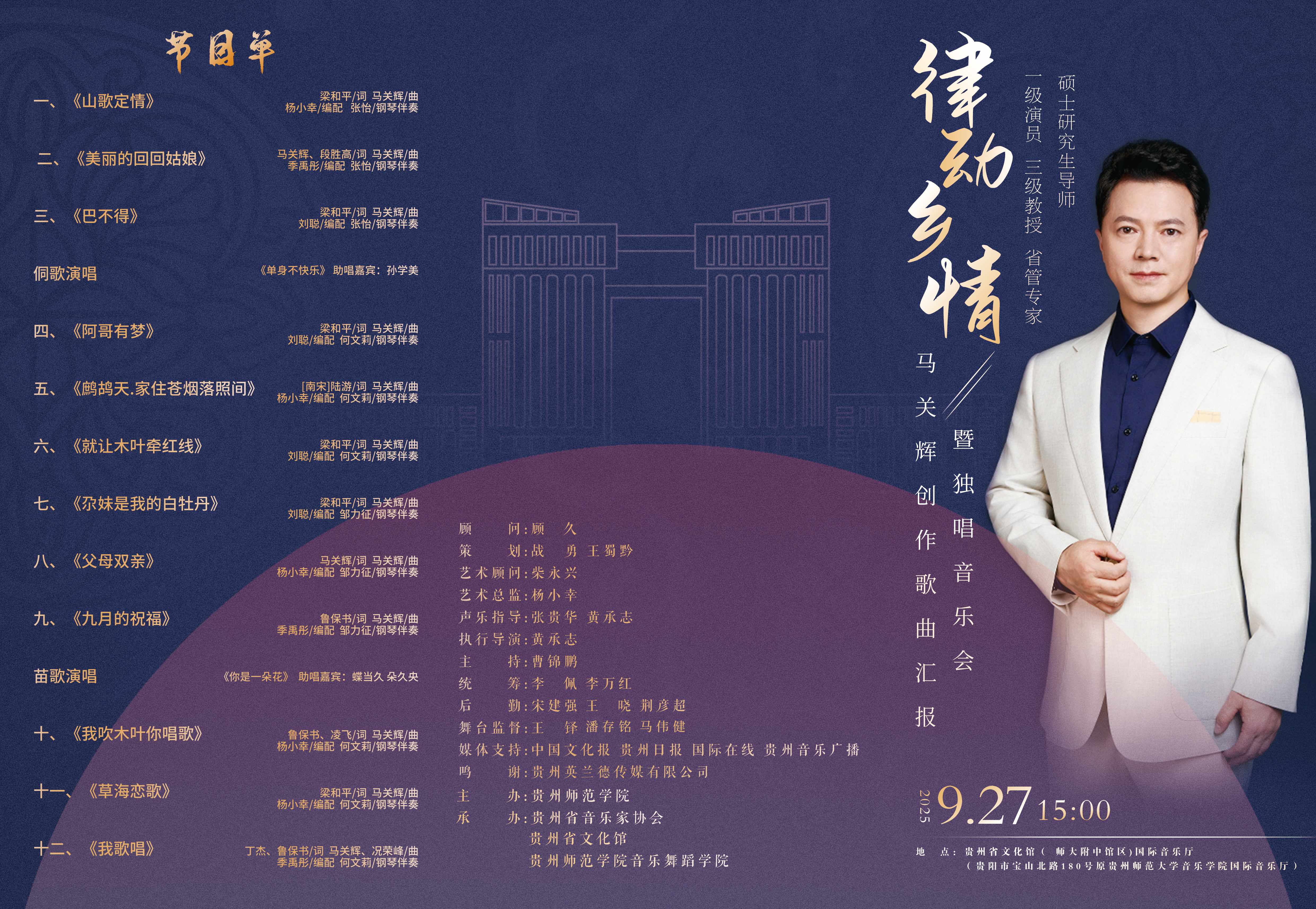 马关辉,回族,中共党员,男高音歌唱家,万象城网页版音乐舞蹈学院院长。国家一级演员,三级教授,硕士研究生导师,贵州省“四个一批”人才、“省管专家”、“学术先锋”、“教育系统工作表现突出个人”。教育部高等学校音乐与舞蹈学类专业教学指导委员会委员,国家一流专业评审专家,教育部普通高等学校师范类专业认证专家,音乐学国家一流专业负责人,贵州省高等学校艺术类专业教学指导委员会副主任委员,中国音乐家协会会员,贵州省音乐家协会副主席。 1995年毕业于威宁民族师范学校,分配到威宁县第一小学任教;1998年考入贵州师范大学音乐系,师从张贵华教授学习声乐,2003年以专业第一名的好成绩毕业于贵州师范大学,同年调入贵州省歌舞团任独唱演员,2012年6月调入万象城网页版。先后师从杨世敏、张贵华、胡大舜、黄承志等老师学习声乐,演唱博采众家之长,形成了音域宽广流畅,音色纯正甜美,感情淳朴真挚,风度卓而不群,于洒脱中见细腻,在热烈中蕴深沉的演唱风格,深受人民群众的喜爱。 长期从事声乐教学和歌曲创作,曾获首届“多彩贵州”歌唱大赛专业组民族唱法银瀑奖,第四届、第六届、第七届中国音乐“金钟奖”声乐比赛贵州赛区金奖,第六届中国西部十二省区民歌大赛金奖,第十届中国西部民歌传承贡献奖,第四届全国高校廉政文化作品大赛表演类第一名;创作歌曲曾获全国高校廉政文化作品大赛艺术类“精品作品奖”,贵州省文艺奖音乐类一等奖等奖项。 曾在国内公开刊物上发表多篇专业学术论文,代表作有:《分析声乐表演中不良心理素质的成因及矫正》《探讨声乐教学中的耳朵话题》《提高声乐演唱水平的几个因素》《高校音乐教育专业有效管理模式分析》等。 出版《悠悠乡情》《阳光之城我的家》《贵州舞起来》《你的爱》等4张个人演唱专辑,出版《迎来幸福好时光——马关辉创作歌曲集》专著一部;课题《贵州红色音乐文化传承研究》获贵州省2023年度哲学社会科学规划课题,歌曲《我在乡村迎接你》获国家艺术基金(一般项目)2024年度资助项目。 代表国家文化和旅游部出访美国、加拿大、俄罗斯、英国、韩国、日本、马来西亚、菲律宾、澳门等国家和地区,为传承贵州民族音乐文化作出积极贡献。