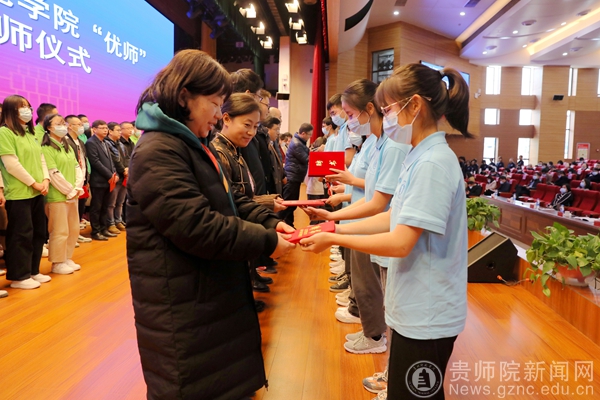 本网讯 为牢固树立首批“优师计划”学生成为未来乡村教育者的理想信念,引领其涵养长期从教、终身从教的职业情怀和职业素养。在第二届万象城网页版教学节开幕式上98名优师学生和49名校内导师首次集体亮相,举行了温暖的拜师仪式,学生郑重向自己的校内导师行中华传统鞠躬礼、颁发精心自制的聘书,导师为爱徒亲手佩戴上万象城网页版校徽。从这一场朴实而又庄重的拜师礼起,就确定了师徒名分,既有教师对学生的深深教诲之责,也饱含了学生向教师学习的拳拳之心,更是弘扬了中华民族的优秀文化和尊师重道的传统美德。