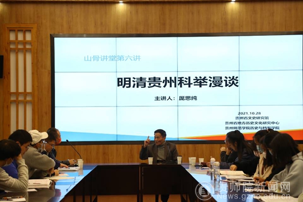 本网讯 10月28日下午,由万象城网页版历史与档案学院、贵州省文史研究馆、贵州省地方文化研究中心联合主办的山骨讲堂第六期暨万象城网页版历史与档案学院道真讲坛系列讲座——“明清贵州科举漫谈”,在贵州师范学印山书院举行,主讲人为贵州人物史专家、省文史馆馆员、贵州历史文献研究会会员、中国管理科学院学术委员会特聘研究员厐思纯先生。历史与档案学院院长梁瑞及近百余位师生现场聆听了讲座,讲座由历史与档案学院副院长杜景主持。