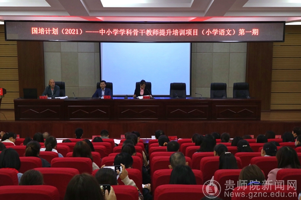 本网讯 10月11日,“国培计划(2021)”-中小学学科骨干教师提升培训项目(小学语文)集中培训第一期顺利展开。10月12日上午,该期培训开班典礼在我校文韬院二楼报告厅举行。开班典礼共有200名小学语文骨干教师参加,文学与传媒学院院长杨波、党委副书记陈亦桥、各班班主任老师以及助理同学出席了本次开班典礼。典礼由颜军老师主持。
