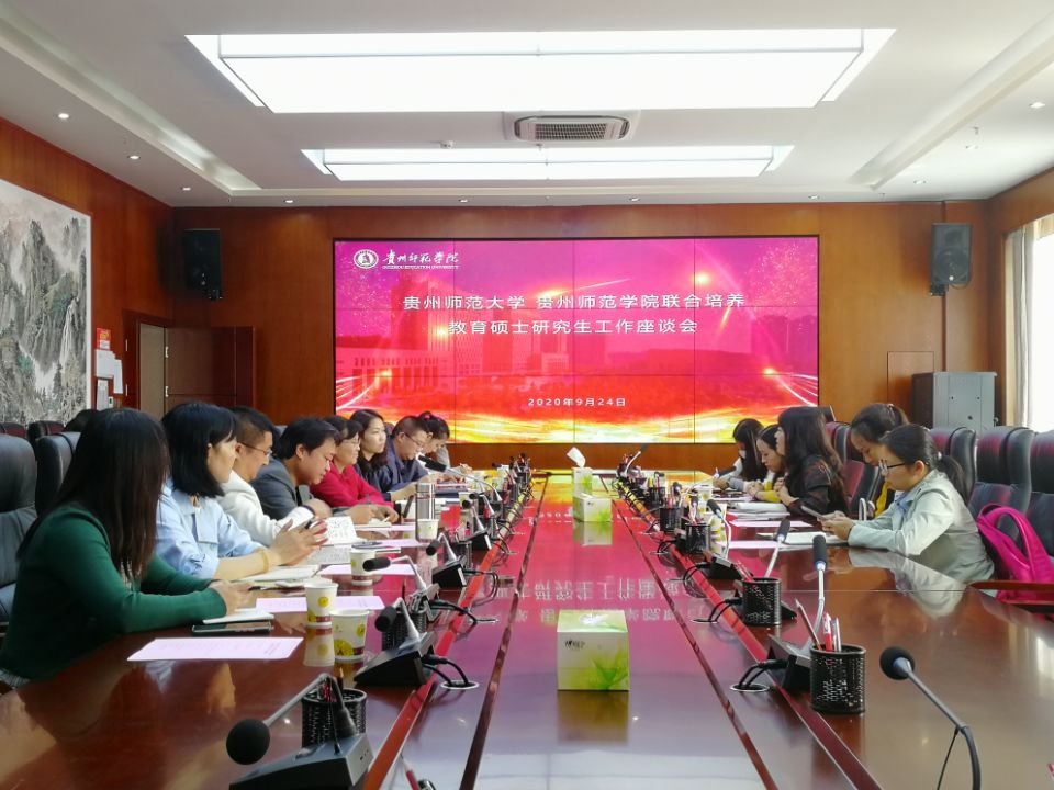 本网讯 9月24日上午,我校与贵州师范大学联合培养教育硕士专业学位研究生工作座谈会在我校信息楼二楼会议室召开,校党委副书记郭文,贵州师范大学研究生院副院长罗筱霖、沈光先,联合教育办公室主任李思维、培养办公室主任秦亦婷、学科办公室主任赵云环出席会议,会议由我校研究生院副院长黄丹主持。