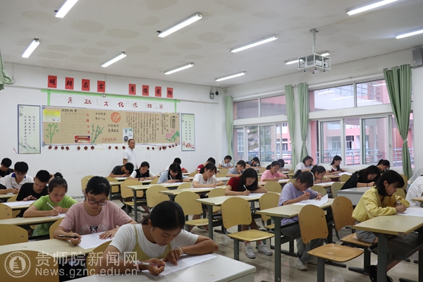 同学们提前进入考场准备考试。本次考试时长两个小时,主要从三个方面进行考察,即修身养德、学校规章制度及国家级省级规章制度。试题更侧重于对学校相关校规校纪的考察,目的是让同学们了解学校的纪律,并遵守纪律不违反纪律。在考试过程中,同学们奋笔疾书,各位领导尽职尽责,认真监考。整场考试下来,同学们都认真答题,严格遵守考试纪律,并没有出现违反纪律的学生。其次,在考试中,各领导都在本考场来回巡视监督。虽然要求严格,但是体现了领导们对同学们的关心。