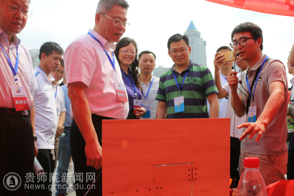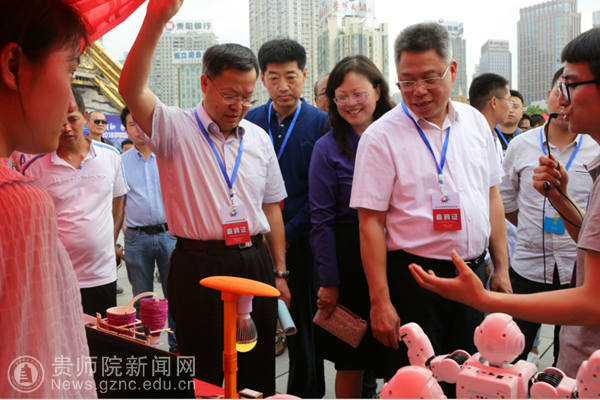 当日上午,副省长王世杰、省科技厅厅长廖飞、省科技厅副厅长秦水介、省科协党组书记张美圣、贵阳市副市长孙志明等领导和专家一行在马敏耀、郭龙、王桥老师的陪同下参观了我校展区,王桥老师向王世杰副省长一行介绍了我校在科技创新和科普示范方面的工作概况,并介绍了贵州省R3UV新一代信息技术科普示范基地的基本情况,随后一一介绍了我校展示的科技作品和科普宣传内容,并对领导提出的问题一一做了讲解。参观过程中,王世杰副省长对展示的科技作品连连赞美,并与师生们亲切交谈。