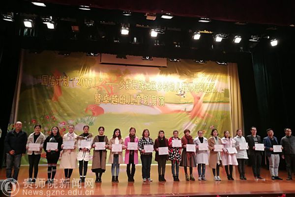 本网讯 11月23日下午,我校在逸夫楼演播厅隆重举行“国培计划(2017)——少数民族地区乡村幼儿教师培训团队研修项目”阶段总结。校级督导吴在东老师应邀出席晚会,教育科学学院党委书记彭祥友、副书记袁川、副院长黎平辉、副院长郑玉莲以及学院部分项目指导教师莅临现场,部分学生到场观看。总结典礼包括培训回顾、优秀学员颁奖及“国培计划(2017)” ——少数民族地区乡村幼儿教师培训团队暨卓越班儿童剧展演。