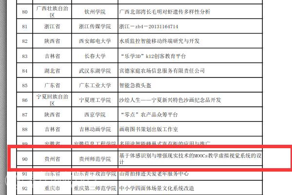 本网讯 我校大学生创新创业训练计划项目《基于体感识别与增强现实技术的MOOCs教学虚拟视觉系统设计》入选“国创计划十周年”庆典暨第十届全国大学生创新创业年会展示项目。本次年会经各省教育部门推荐,共收到各类项目846项,经过相关学科专家初评、“国创计划”专家工作组、协作组复选,遴选出参加“国创计划十周年”庆典暨第十届全国大学生创新创业年会的学术论文166篇,创新创业展示项目188项,创业推介项目49项,共计403项。