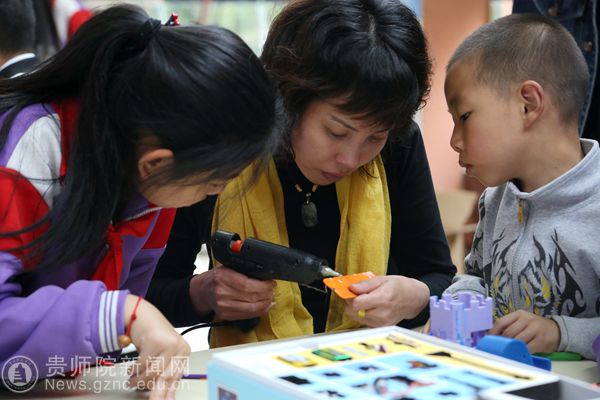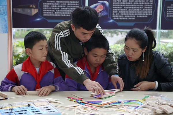随后,小朋友们在我校互联网+创新创业中心工作室成员的指导下动手创作。制作活动进行到大约半个小时后,一个由五颜六色的竹签搭建的房子完工了,这是骆科帅小朋友的作品,他是在他母亲及我校15级数计学院宋刚的辅助指导下完成的。宋刚说:“这个制作活动考验着小朋友的动手和思维能力,如果他们想要做什么,就要想法激发他们自己发挥出来。”
