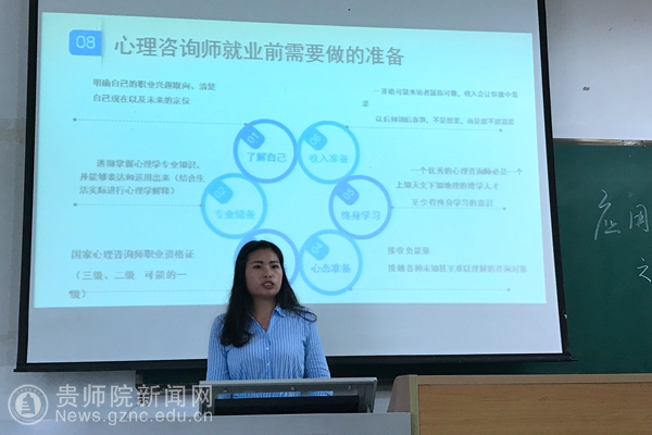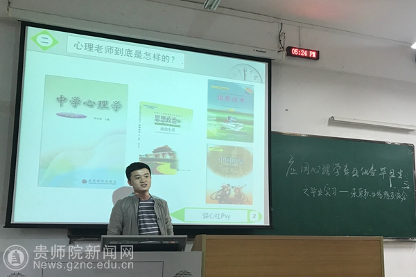 本网讯 5月21日,教育科学学院应用心理学专业在我校逸夫楼303教室举行“毕业实习—未来职业畅想”经验交流会。会议由应用心理学专业教研室主任金欢欢主持,共邀请到现工作于贵州经贸职业技术学院、龙里县民族完全中学、贵州省兴义监狱、贵州师范大学和贵阳海之源心理咨询服务中心等单位的五名应用心理学专业优秀毕业生到场交流。