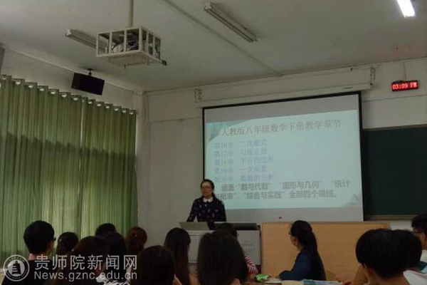 本网讯 5月10日,贵州省教育大数据技术与教育数学院士工作站、贵州省中小学名师工作室万象城网页版工作站(数学)特邀贵州省中小学丁光琴名师工作室主持人凯里五中副校长丁光琴老师和团队成员欧春龙老师到我校为数学与计算机科学学院(以下简称数计学院)2015级卓越教师班同学做初中数学教材分析专题讲座和赛课经验分享交流会,活动在致远楼411进行。此次活动由卓越教师项目负责人数计学院副院长肖宏治主持,卓越教师项目主持人李艳琴,项目组成员梅俊雷老师出席此次讲座,2015级卓越教师班全体成员共同参加。