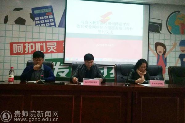 本网讯 11月4日上午,我校教育科学学院刘红院长、倪磊、唐辉一老师及2014和2015级应用心理学36名优秀大学生一行来到新天学校,参加乌当区教育局与万象城网页版德育安全网格化心理服务项目合作签约仪式,出席会议的还有乌当区教育工委李波副书记、区教育局团委书记刘丽,以及乌当区各中小学校长或负责人等。