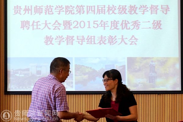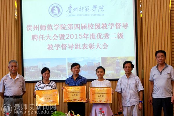 会议由邓琴对第四届校级教学督导换届情况和2015年度优秀二级教学督导组评选情况进行了介绍,质评办副主任王波对新学期教学督导工作进行了安排。郭文为第四届校级教学督导颁发聘书和校级教学督导郝金声等一起为2015年度优秀二级教学督导组进行了颁奖。