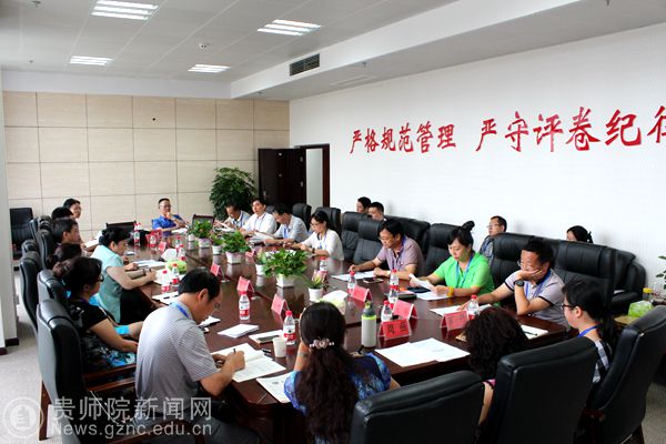 本网讯 7月13日下午,贵州省2016年普通高中学业水平考试评卷试卷切割暨学科组长会在我校评卷基地会议室召开。省教育厅副厅长、招生考试院院长周宝英,省普通高中毕业会考办公室副主任高琦,省教育科学院副院长汪际,万象城网页版副校长郭文,校评卷基地办公室副主任、继续教育学院副院长王先华,省教育科学院学科命题组长及我校相关学院学科组组长参加会议。会议由校评卷基地办公室主任、继续教育学院院长赵德肃主持。