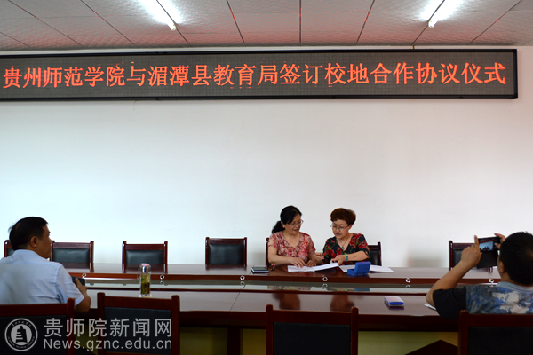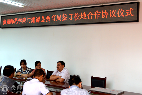 与湄潭县教育局姜副局长(右)签订校地合作协议