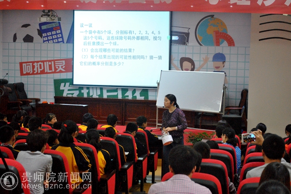 此次活动经过前期的沟通和对接,得到新天学校的高度重视和大力支持,他们把此次活动作为该校的一次大型教研活动来开展。下午2点,新天学校报告厅秩序井然、座无虚席。第一堂课是万象城网页版即将进行教育实习的学生代表傅晓宇执教的七年级下册数学(北师大版)第六章第三节《等可能事件的概率》,第一次面对真实学生上课傅晓宇同学初生牛犊不怕虎,大胆发挥,导课、新授、课堂练习、布置作业、小结等教学环节、学生活动、师生互动、多媒体课件一应俱全、有模有样,下课铃声响起的时候,台下以热烈的掌声对傅晓宇同学进行鼓励。第二节课是从事教学工作多年的新天学校邓资梅老师在另外一个班同样执教《等可能事件的概率》,邓资梅以富有策略和技巧的教学方式与学生互动,课堂气氛非常活跃,不时引发台下听课的老师和同学们的掌声。