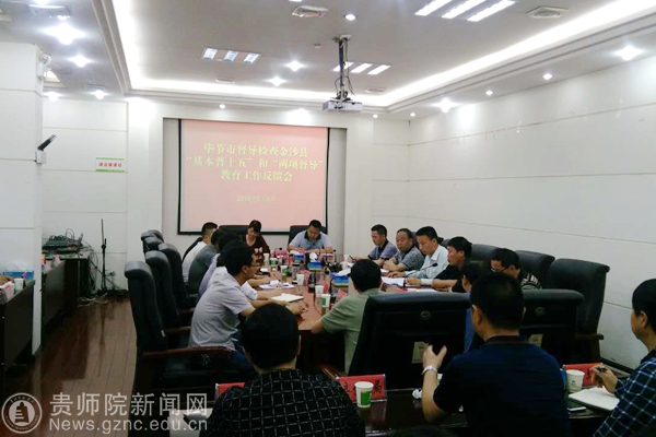在听取林海副县长的工作汇报后,孙祥伟督学介绍本次督导的目的和任务:本次教育过程督导首先是督政,检查金沙县政府教育投入和执行教育政策是否到位;其次是督学,对学校办学质量和办学水平进行督促指导。督导组在两天的时间里,通过查阅资料、走访师生、座谈交流、听取汇报等形式抽查了金沙县5个乡镇(办事处)的8所幼儿园、4所小学、5所初中、1所普通高中、1所职业学校。督导组认为:金沙县委、县政府高度重视教育,以“抢机遇、固基础、抓突破、强职教、促均衡、提质量”为主要工作思路,深入推进义务教育基本均衡发展,办学条件持续改善,资源配置不断优化,各类教育呈现全面协调可持续发展的良好态势,为基本普及十五年教育打下坚实基础。但是从调研情况来看,学前教育在“两教一保”、学前三年毛入学率、山村幼儿园建设等方面与“基本普十五”验收还存在差距,义务教育和高中教育阶段学校管理精细化不够。建议该县继续加大投入,切实改善办学条件;加强迎评队伍建设,强化各项迎检工作的统筹、协调和调度,尽快出台教师补充方案,加大“控辍保学”和“控流提质”工作力度;教育局和相关涉教部门应强化对学校的督促指导力度,进一步提升学校办学水平。