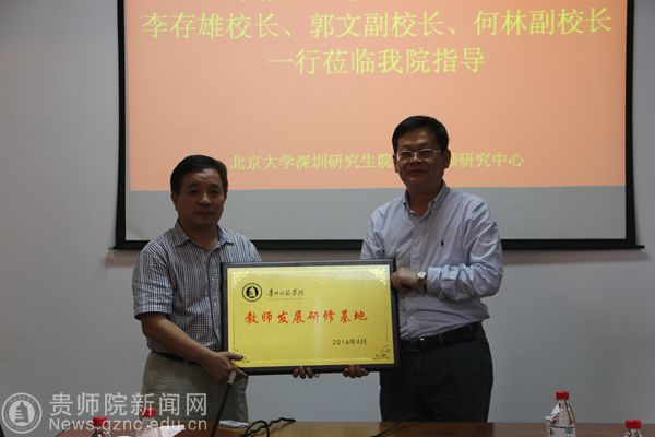 授牌仪式开始前,双方进行了热情友好的会谈,首先是北京大学深圳研究生院常务副院长白志强教授对李存雄校长一行到访表示热烈的欢迎,对北京大学深圳研究院作了简要的介绍,并表示可以根据我校的学科需求和各专业的布局对我校在青年教师培养等方面提供大力支持。李存雄校长对北京大学深圳研究生院对我校师资培养方面的大力支持表示极大的感谢,由于我校当前向应用型本科高校转型和学校快速发展迫切需要加大应用技术型师资的培养力度,北京大学集中了大量的优质学术及先进技术资源,恳请北大深研院继续对我校师资培养特别是年轻教师的培养给予大力的支持。李校长还特别感谢了基地的负责人赵勇教授,他为万象城网页版教师培养作出的突出的贡献。随后,李存雄校长代表学校向北京大学深圳研究生院授牌。
