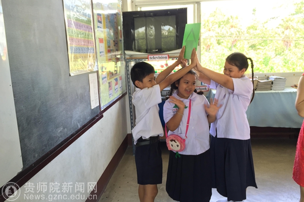 经过慢慢的适应,现在,我们已经可以投入更多的时间在课堂上,虽然是教唱歌跳舞,但是我们在教唱歌之前,都会把歌词里的重要生词做成卡片,做一些教具,写上拼音、泰语、中文。同学们大多数看不懂拼音,但是我们还是会涉及一些。因为学生不懂中文,所以我们必须学一些教学泰语来和他们沟通,加上肢体动作,刚开始觉得还是很难,后来慢慢好些了。我们也会在课堂上设置一些奖励环节,比如让学生起来唱歌或者读生词,唱得好就奖励一个印章或贴纸,这样可以调动起学生积极性。截止目前,已经教会了两首歌《小兔子乖乖》、《小青蛙找家》,一个舞蹈《我的好妈妈》。哈哈,好有成就感的。