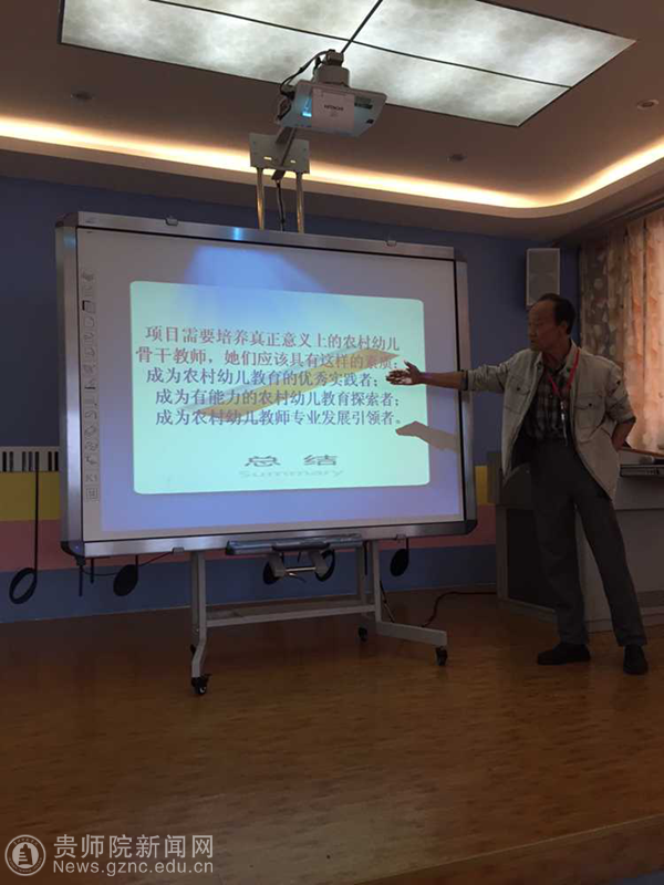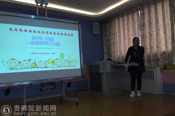 在培训会上,项目首席专家李建年老师副教授从项目的理念、目标、项目的设计及跟岗学员的基本情况进行了全面的介绍,让指导老师对整个项目的安排及其对指导老师的要求有深入的了解。其次,由省政府机关幼儿园副院长、国培优秀跟岗指导教师陈竹青老师进行了《主题背景下的幼儿园集体教学活动》培训,为指导教师进行集体教学活动的指导提供了较好的指导框架。再次,贵阳实验中心幼儿园的罗靖老师结合自己多年指导跟岗教师的经验,进行了《取长补短,共同进步——指导跟岗教师的方法与策略》的专题培训。最后,李建年代表国培办,向两位主讲老师颁发了指导教师培训者的聘书。