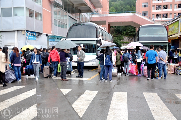 9月20日上午,下着蒙蒙细雨,来自各个专业的近一百五十名实习生大包小包落地,精神饱满的等待出发,教务处副处长陈业强冒雨亲自带队送实习生赴黔西县。发车前,教务处龙诚老师与杨通槐老师耐心的引导实习生安放好行李,有序上车。一切工作就绪后,在挥手的离别中,三辆大巴车驶向了目的地。