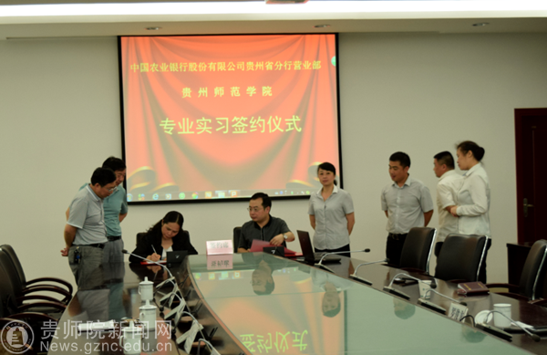 随后,双方共同签订了实习基地协议。根据协议,中国农业银行贵阳市支行分行将为学校优秀学子提供实习的岗位,并派业务骨干进行实现指导。我校学生将严格遵守农行规章制度,通过一线的工作学习和锻炼,将理论知识转化为实践能力。