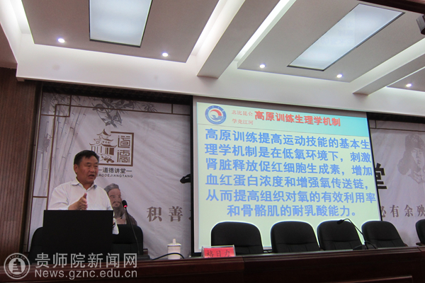 格日力教授从高原定义与环境、高原训练方法、高原训练生理学机制等方面深入浅出地讲述高原自然低氧环境对人体所产生的特殊生物学反应。在演讲过程中,格日力教授首先通过向在座的师生展示大量在国内外所做高原训练的实验,阐述了什么是高原训练以及高原训练的方法;然后,格日力教授对比不同地区和民族的人对高原环境的不同反应,运用大量的测量数据和图表展现人体高原训练的生理学机制,分析高原环境下人体所产生的生物学反应;最后,格日力教授谈到了高原反应的表现、在旅行过程中如何减轻高原反应以及间歇性低氧刺激与瘦身等热门话题。