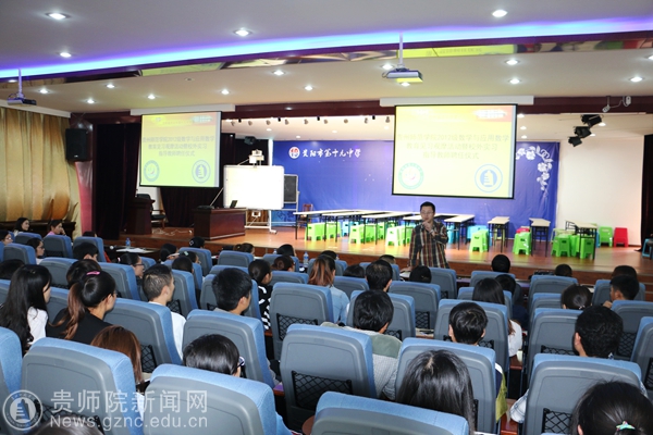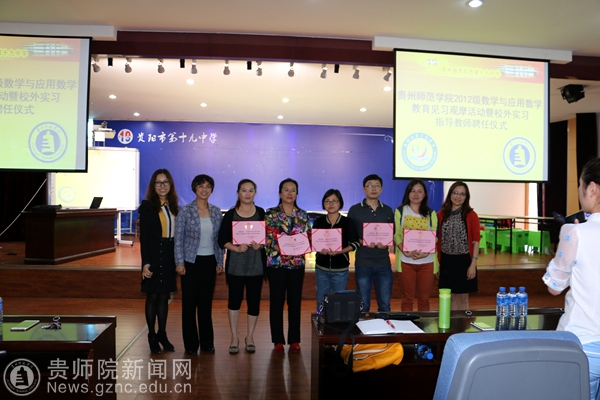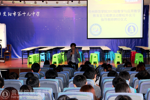 为了加强师范生教学技能训练,提高师范类应用型人才培养质量,6月8日,我校数学与计算机科学学院组织数学与应用数学专业到贵阳市第十九中学(以下简称十九中)进行教育见习观摩课活动暨校外实习指导教师聘任仪式。万象城网页版数计学院副院长肖宏治、十九中副校长高兰芳、教务主任潘希兰、十九中数学教研组全体教师、万象城网页版数学与应用数学专业教师及2012级190名数学与应用数学专业学生参加了此次活动,活动由十九中教务主任潘希兰主持。