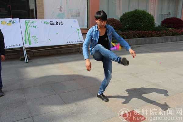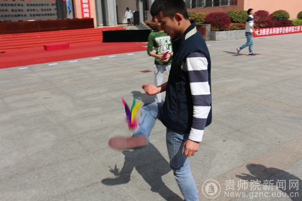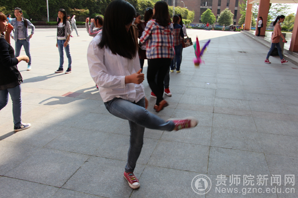 3月31日课间时分,在演播厅门口能看到一种特殊的健美方式——踢毽子。历史与社会学院将要举行踢毽子大赛,学院基层团委学生会组织同学们在比赛之前做好练习。