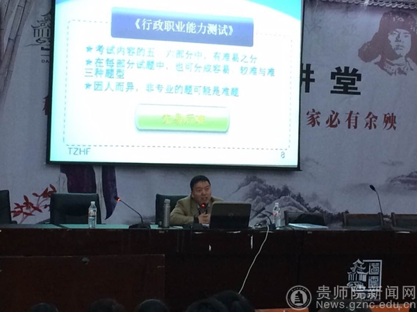 讲座上,长期从事公务员招考笔试命题工作的唐正繁用生动的语言分别从公务员招考政策、行政职业能力测试、申论写作,以及历年招考变化等方面进行指导,并结合公务员招考答题技巧、形式变化、就业前景与机遇等问题进行了深入讲授。讲授过程中,唐正繁还引用了国家、贵州省公务员招考的历年真题进行模拟测试,使同学们切身感受解题环境。最后,唐正繁对我校即将面临就业的莘莘学子提出了宝贵建议,同时强调毕业生在踏上工作岗位之后,需要怀着一种虚心的学习态度,对工作踏实肯干、执着追求。