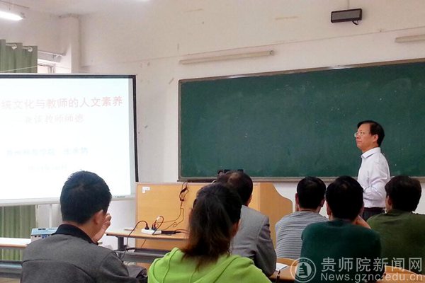 在讲座过程中,张承鹄教授围绕教师的师德修养这个主题展开,详细阐释了儒家和道家两大学派的思想精髓,并以社会中备受关注的教师师德等问题作为切入,以古代儒道等几大学派的思想来透视这些问题产生的原因和对策。