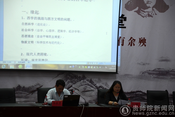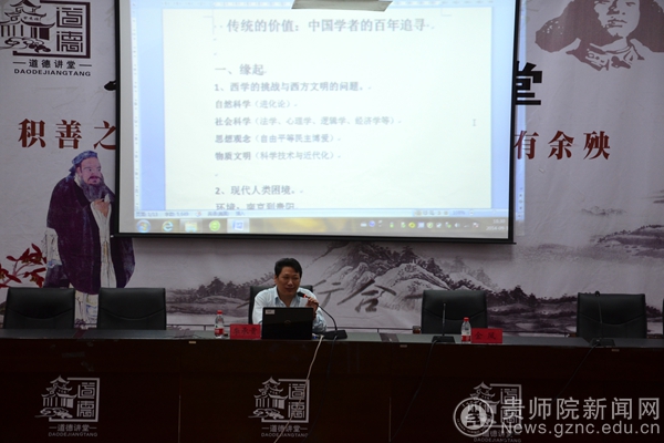 9月17日下午6:30,应我校邀请,南京大学哲学系(宗教学系)博士生导师、学术委员会委员,江苏省哲学社会科学“儒佛道治理思想研究”优秀创新团队负责人,江苏省高校人文社会科学重点研究基地“儒佛道与中国传统文化研究中心”具体负责人李承贵教授莅临我校作主题为“传统的价值:中国学者的百年追寻”的讲座。讲座由科研处主办,马列主义教学部、经济与政治学院、中国哲学研究所共同承办,马列主义教学部主任金凤教授主持讲座,马列主义教学部部分教师、中国哲学研究所部分研究员、经济与政治学院部分师生共260余人聆听讲座。