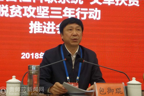 本网讯 为深入推进贵州省深度扶贫地区扶贫攻坚行动,充分发挥“文军”助推扶贫攻坚的重要作用,推动全省哲学社会科学事业在习近平新时代中国特色社会主义思想引领下创新局面、谱写新篇章。11月8日至9日,全省社科联系统“文军扶贫”脱贫攻坚三年行动推进会在中国凉都六盘水市召开。省社科联党组书记、副主席包御琨,六盘水市委常委、宣传部长、社科联主席刘睿,省社科联党组成员、副主席刘宗严,省社科联党组成员、秘书长刘丰泉,省社科联巡视员宋健等领导出席会议。各市州、省属学会(协会、研究会)、高校社科联负责人及我校科研处处长王平瑞、非物质文化遗产研究中心相关工作人员近100人参会。会议由刘宗严主持。