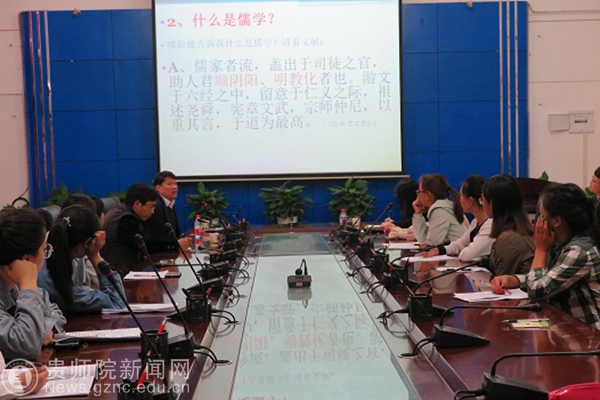 李承贵首先提出了“儒学是关切生活的学问”这一论点,围绕这一论点,李承贵从“儒学对物质生活的追求”、“儒学对精神生活的丰富”、“儒学对公共生活的改善”三个方面展开论述。对“儒学对物质生活的追求”上,他用“先富后教”、“制民之产”等例子进行论述;对“儒学对精神生活的丰富”上,李承贵对儒家的精神生活做了四个层次的划分,一是娱乐生活,二是求知生活,三是情感生活,四是道德生活。对“儒学对公共生活的改善”方面,他归纳概括出三个方面,一是“不知礼,无以立”,二是“礼之用,和为贵”,三是“非礼勿视勿听勿言勿动”。最后,他针对师生所提的关于儒学与国学区别、儒学的当下形态等问题进行了耐心仔细的回答,使大家听了豁然开朗,精神振奋。