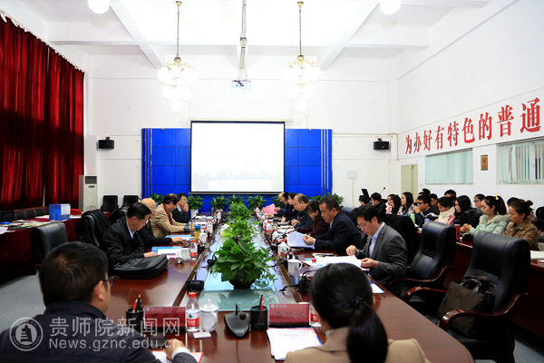 本网讯 11月24日上午,省社科联巡视员吴黔斌率专家龚振黔、张继泽、刘爱莅临我校开展2017年度贵州省哲学社会科学创新团队复评考察工作。复评考察工作分两个阶段进行,首先在第一会议室召开座谈交流会,校长郁钟铭、副校长郭文出席座谈会,相关学院、部门负责人,贵州省乡村旅游资源开发与旅游扶贫研究创新团队代表参加,副校长郭文主持座谈会。