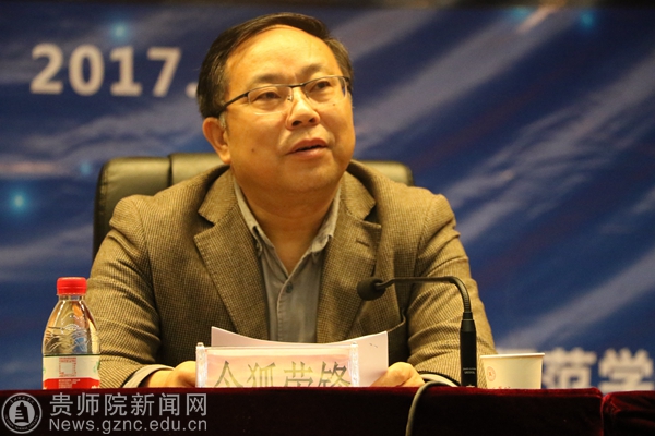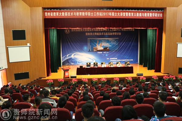 本网讯 11月10上午9时,贵州省教育大数据技术与教育数学院士工作站(以下称院士工作站)2017年院士大讲堂暨教育大数据技术与教育数学研讨会在逸夫楼演播厅开讲,出席活动开幕式的领导及嘉宾有:中国科学院院士张景中,我校副校长令狐荣锋,贵州省教育科学院教研员朱龙,我校科研处处长金凤,我校教务处处长熊世恒,院士工作站负责人、我校数计学院院长左羽,张景中院士专家团队,教育数学院士实验学校领导及老师代表,我校院士工作站研究团队全体成员,成都景中教育软件有限公司负责人及我校数计学院师生代表,共计400余人参加会议。会议由左羽主持。