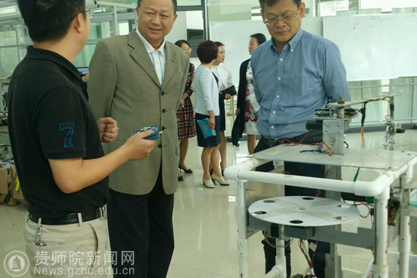 孙国强首先听取了崔忠伟对中心的基本情况、工作的开展及取得的成绩的简单汇报,并听取学生介绍自主研发的循迹机器人和打羽毛球的机器人。