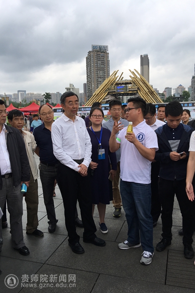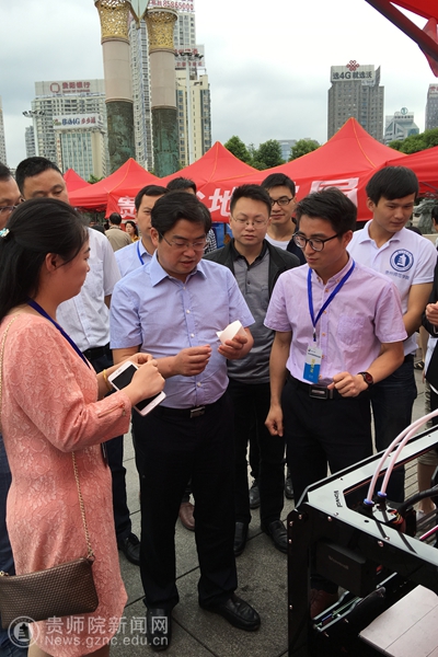 贵州省政协副主席谢晓尧和共青团贵州省委员会副书记徐锡广分别参观了我校的展品,并和参展的同学们亲切交流。对于参展作品,谢晓尧说道,作品很有新意,有较高的科技含量和市场应用价值,希望同学们能够再接再励,学以致用,在科技创新上做出更好的成绩。