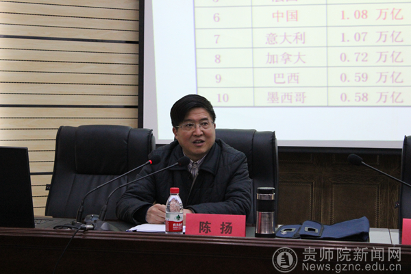 讲座开始,陈扬首先向同学们介绍了中国和世界其他国家的经济发展比较,全面阐述了中国的经济发展变化和形势,由此引申出贵州的经济发展现状和未来走向,点明了贵州的经济起步晚,发展缓慢的历史原因,但在国家政策的大力扶植下,贵州因地制宜的制定了适合自己的发展之路,使得贵州GDP近几年以惊人的速度增长,后发赶超,争取在2020年和全国一起实现全面小康。