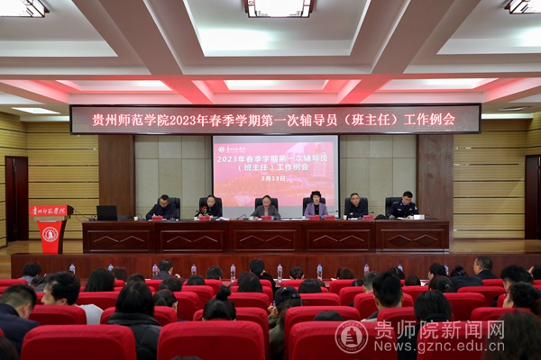 本网讯 为学习贯彻落实党的二十大精神,提升专兼职辅导员队伍政治教育工作能力,做好校园安全稳定工作。3月13日,我校2023年春季学期第一次辅导员工作例会在道德讲堂顺利开展。校党委委员、副校长任洁、各二级学院基层党委副书记、全体专兼职辅导员、各学院团委学生科管理人员、学工部、教务处、保卫处、心理健康教育与咨询中心等部门相关负责人参会议,同时会议还邀请了乌当区高新路派出所所长岳奇。此次会议由学工部部长刘红玲主持。