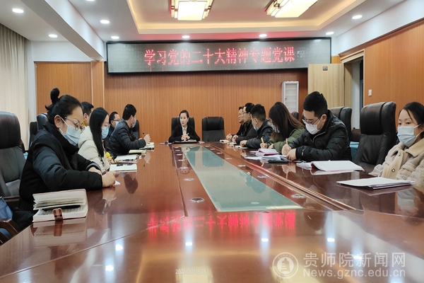 邹晓青首先从美设学院到师院的发展从小到大,由弱到强谈起,上升到贵州十年来日新月异,延伸到国家实力不断的增强;从个体发展到民族命运的发展,这都离不开我党百年来的不断挫折与积累,离不开我党的绝对领导,因此党的二十大具有不同凡响的重要意义。专题党课分三部分进行,第一部分为数读党的二十大,深刻感悟;第二部分为党建引领,深学笃行。第三部分为锐意创新、团结奋斗。她在第一部分系统地解读二十大精神,分别对大会主题、过去十年的成就与经验、党的中心任务和实现路径三个方面作概括和讲解。第二、三部分结合学校情况,学院特点,贯彻落实党的二十大精神,在新时代下立德树人的重要性,尤其是教育、科技、人才强国的重要性认识与落实,实现学院新的发展提出了要求和建议。