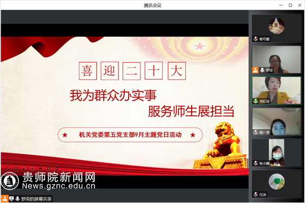 本网讯 为进一步巩固拓展党史学习教育成果,推动党史学习教育常态化长效化,结合当前疫情防控严峻形势,进一步发挥好党支部战斗堡垒作用和党员先锋模范作用,9月25日晚,机关党委第五党支部在腾讯线上会议召开了“喜迎党的二十大 我为群众办实事 服务师生展担当”主题党日活动,机关党委第五党支部全体党员参会,活动由党支部书记刘红玲主持。