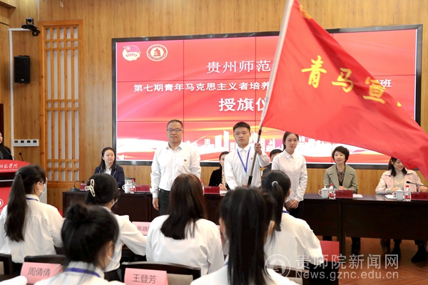 在庄严的国歌声中,学校第七期“青年马克思主义者培养工程”大学生骨干培训开班仪式正式开始。仪式上,郭亚宣读本次培训须知,罗荣宣读临时团支部委员名单。熊志光为第七期培训班授班旗,薛璞授青马宣讲团团旗,刘红玲授青马实践团团旗;全体参会领导为学员代表赠授学习图书。