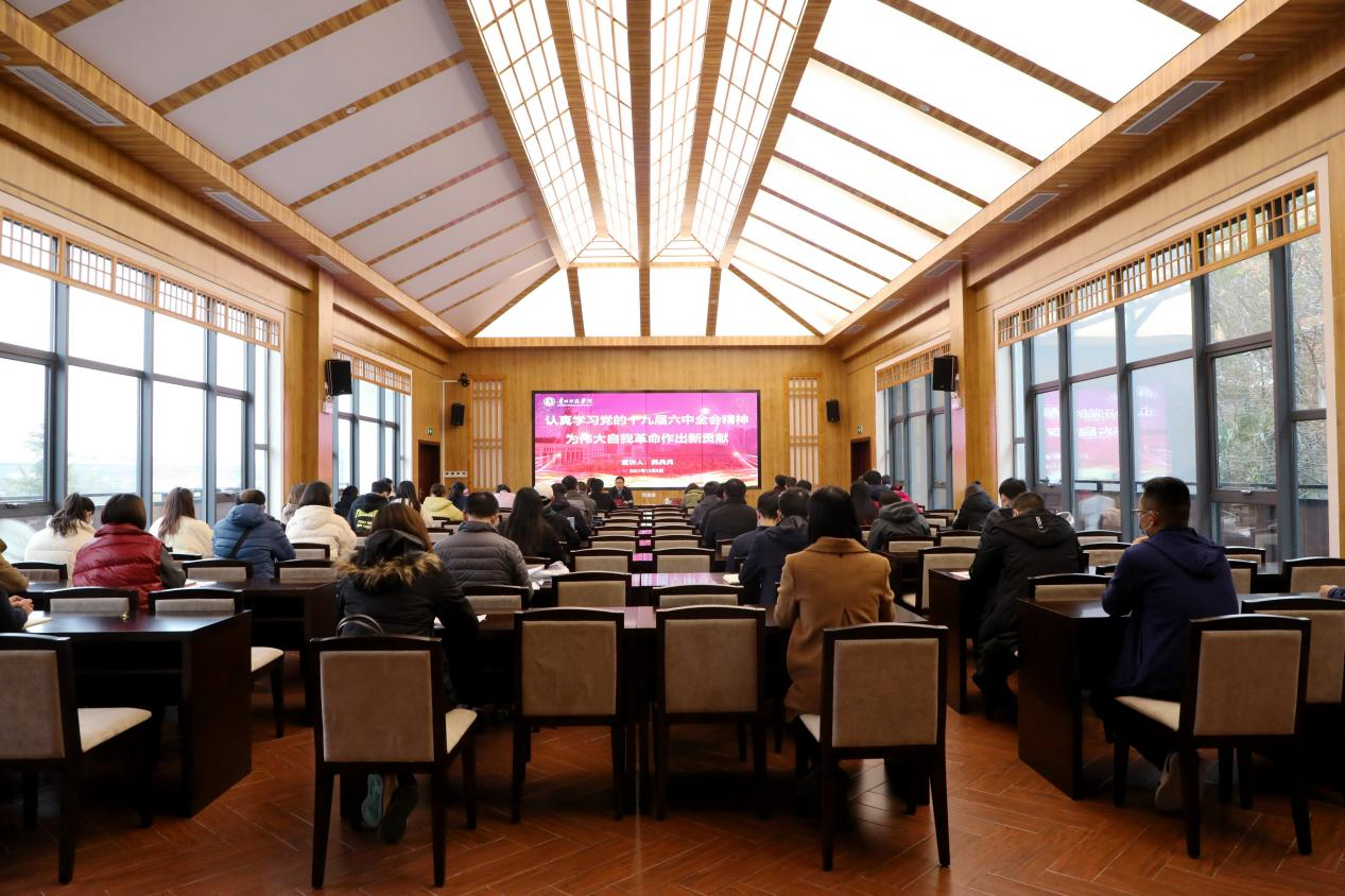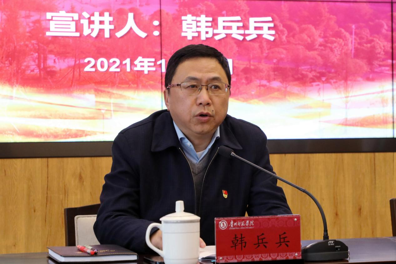 本网讯 12月8日,校纪委书记、省监委驻万象城网页版监察专员韩兵兵在印山书院以《认真学习党的十九届六中全会精神 为新时代伟大自我革命作出新贡献》为主题,对党的十九届六中全会公报和《中共中央关于党的百年奋斗重大成就和历史经验的决议》(以下简称《决议》)精神,深入浅出地向全体纪检监察干部和音乐舞蹈学院教师党支部全体党员及2019级音乐学(一班)团支部同学开展学习贯彻党的十九届六中全会精神专题宣讲。