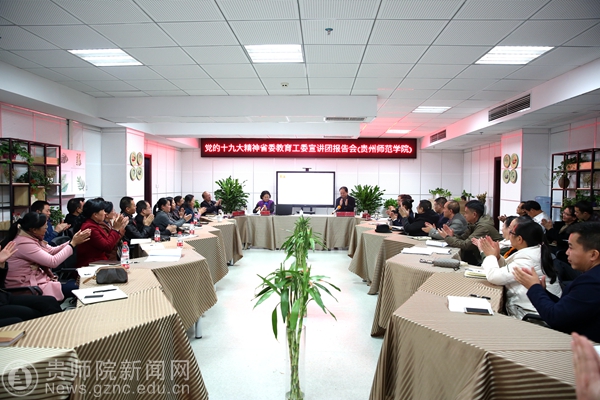 本网讯 11月29日下午,省委教育工委宣讲团成员、贵州师范大学党委书记韩卉到我校作党的十九大精神宣讲报告。全体校领导、基层党委书记、学院院长、部门主要负责人参加会议。校党委书记石培新主持宣讲会。