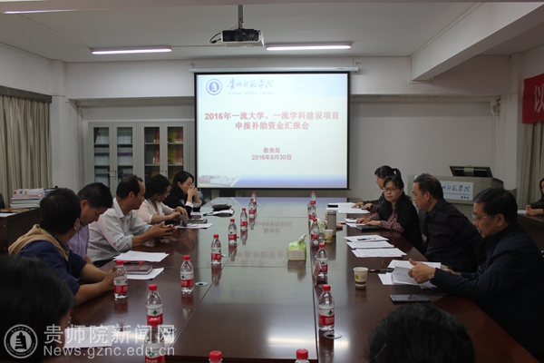 本网讯 9月30日上午,我校在文韬苑教务处会议室召开了2016年一流大学、一流学科建设项目申报补助资金汇报会。贵州师范大学党委副书记刘肇军、我校令狐荣锋副校长和郭文副校长作为评审专家出席了会议。会议由教务处副处长李佩主持。