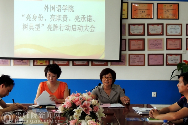 本网讯 6月24日下午,外国语学院“亮身份、亮职责、亮承诺、树典型”亮牌行动大会在学院会议室隆重举行,校党委副书记令狐彩桃出席大会,外国语学院党委副书记刘红玲,全体教工党员、学生党员及部分入党积极分子代表参会,外国语学院基层党委纪检委员张静主持会议。