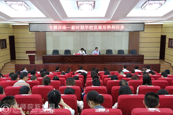 本网讯 5月16日,校长李存雄为我校2016年新任处、科级干部培训班做了关于新时期我校发展形势和任务的专题讲座,党委副书记令狐彩桃和所有新任的处、科级领导干部参加了讲座,讲座由令狐彩桃主持。