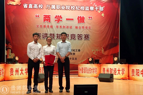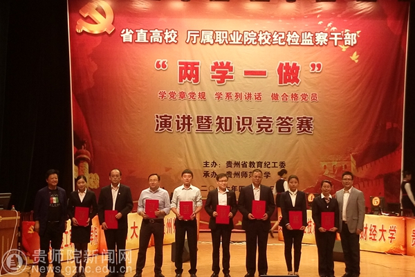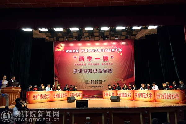 本网讯 4月15日,由贵州省教育纪工委主办、贵州师范大学承办的省直高校、厅属职业院校纪检监察干部“两学一做”演讲暨知识竞答赛在贵州师范大学宝山校区大礼堂举行。此次竞赛以“学党章党规、学系列讲话,做合格党员”为活动主题,以《中国共产党章程》、《中国共产党廉洁自律准则》、《中国共产党纪律处分条例》、《中国共产党纪律检查机关案件检查工作条例》、《习近平关于党风廉政建设和反腐败斗争论述摘编》、《习近平关于严明党的纪律和规矩论述摘编》、《学思践悟》等为学习内容,共有14所高校代表队参赛。