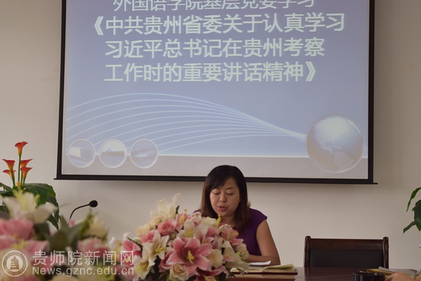 随后,她紧密结合当前学校“一体两翼”的战略布局、学院学科专业的发展前景及正在进行的“三严三实”专题教育活动等重点工作,认真解读了6月18日习近平总书记《在贵州省考察工作结束时的讲话》精神,重点对“扎实推动经济持续健康发展”、“扎实推进生态文明建设”和“扎实加强基层基础工作”三个方面进行了细致地分析与讲解。