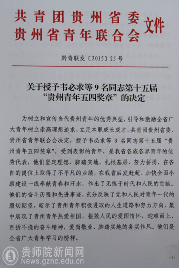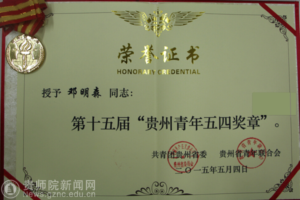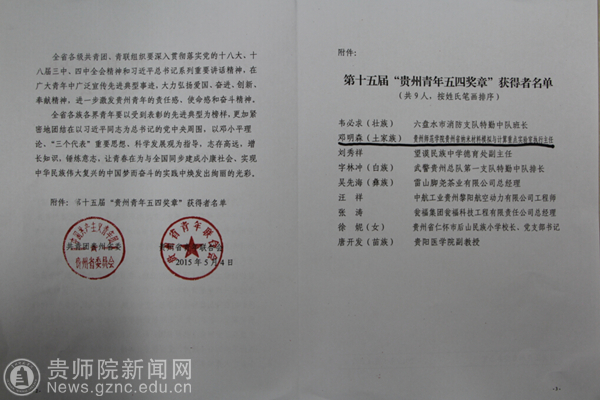 5月4日下午,贵州省五四青年节庆祝活动在贵州省电视台举行,我校邓明森同志被授予了“贵州青年五四奖章”荣誉称号,并受到了省委常委、统战部部长刘晓凯等领导的接见。邓明森同志作为嘉宾出席了贵州省五四青年节大型主题直播活动《青春的旗帜》节目现场并进行了访谈。