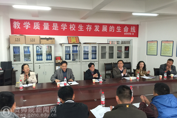 黄天明对体育学院有关情况进行了汇报。令狐荣锋首先讲话,他指出,学校高度重视体育学院工作,这几年体育学院发展很快,教职工已经达到61人,体育学院学生已有七百多人,承担了学校大一、大二近两百个班的大学公共体育课,教学任务很重。随着发展,体育学院师资队伍、管理队伍都存在一些不足。教师队伍中年轻人多,管理队伍院领导班子人员缺乏,随着本科办学水平评估的临近,学校十分关心体育学院工作,这次到体育学院调研,就是想听听各位老师对体育学院手中方面工作的建议和意见。
