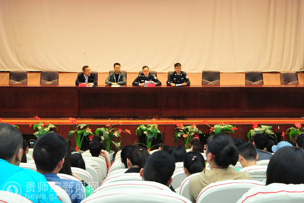 为进一步强化我校师生的法律意识,更好的保护自身的生命及财产安全,4月16日,由我校保卫处、学工部联合主办的法制宣传专题会议在逸夫楼演播厅召开,学校邀请了辖区派出所民警吴斌等三位同志为我校师生进行法制宣传。会议由学工部部长薛璞主持,全校专兼职辅导员、校学生会主席和各学院学生会主席、学生社团负责人、各班班长参加。